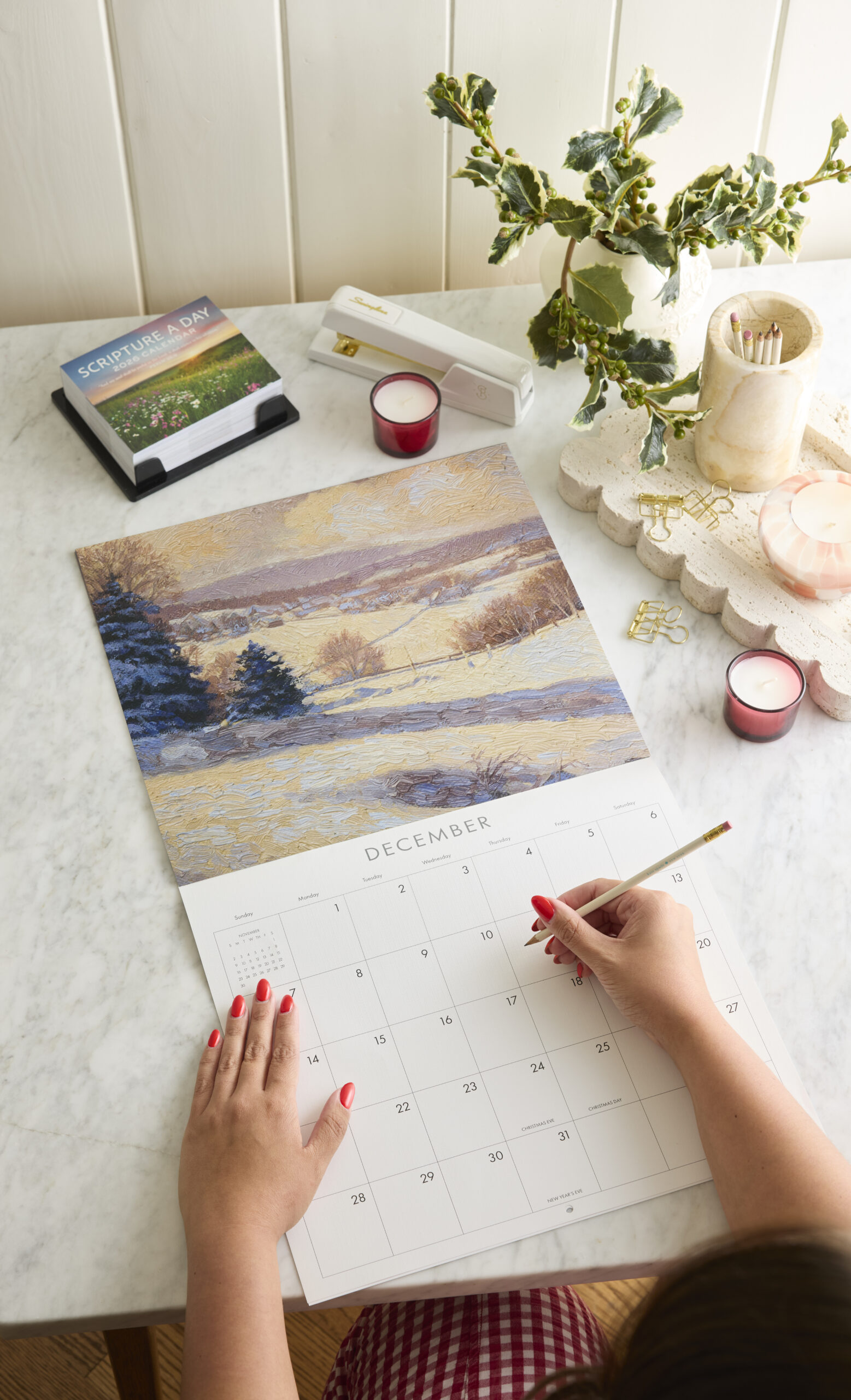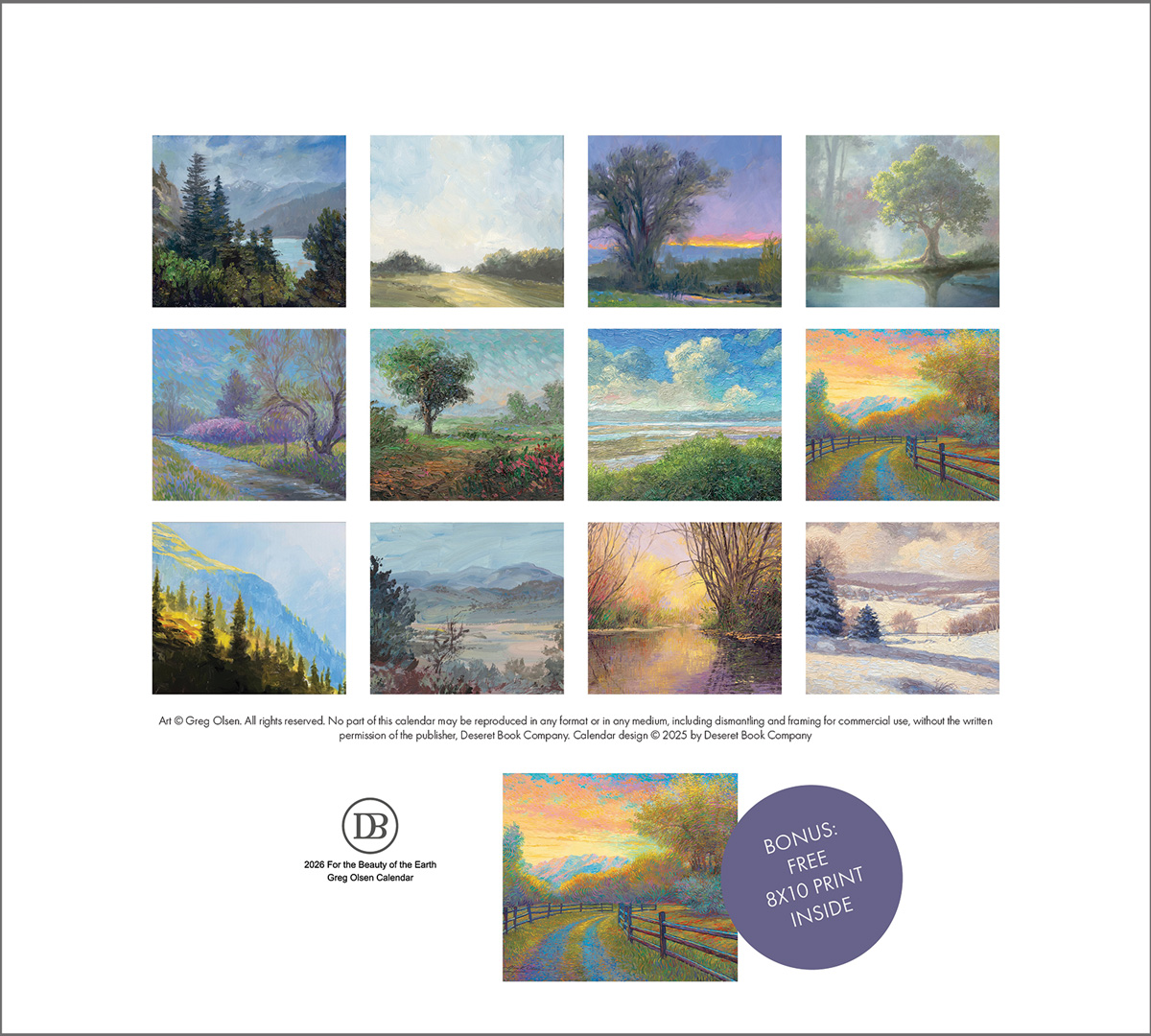 This alternate 2026 Greg Olsen calendar features 12 never-before-seen landscape paintings by Greg Olsen. Enjoy the uplifting artwork of Greg Olsen all year round. This traditional 12-month, wall-size calendar includes a FREE 8x10 print.