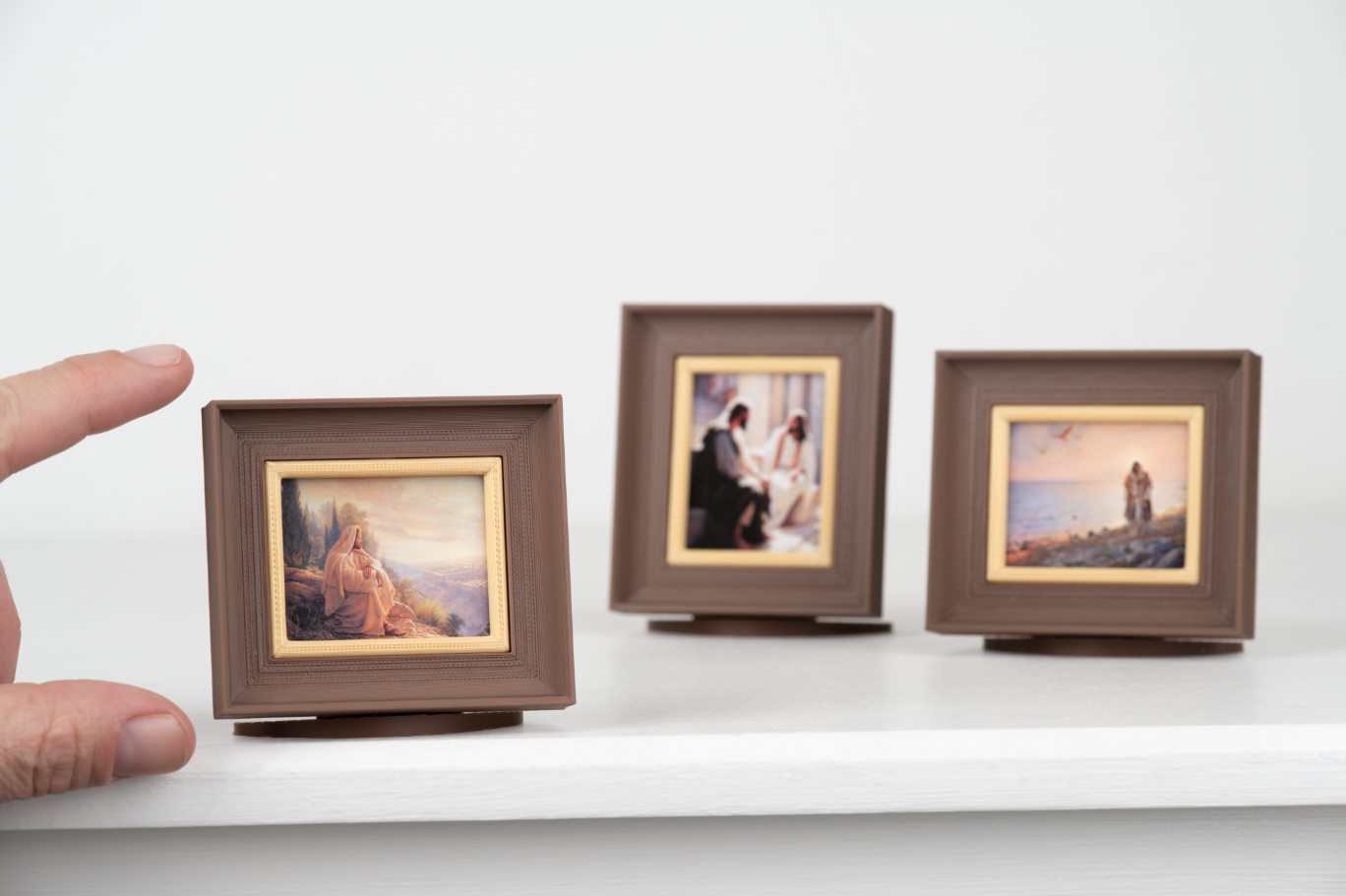 Measuring just 3″ x 2.75″, each frame includes internal magnets for display on metal surfaces and a floating stand that creates the illusion of artwork hovering when placed on a desk or shelf. These thoughtfully designed pieces bring daily inspiration into your home, workspace, or anywhere you need a gentle reminder of the Savior’s love.