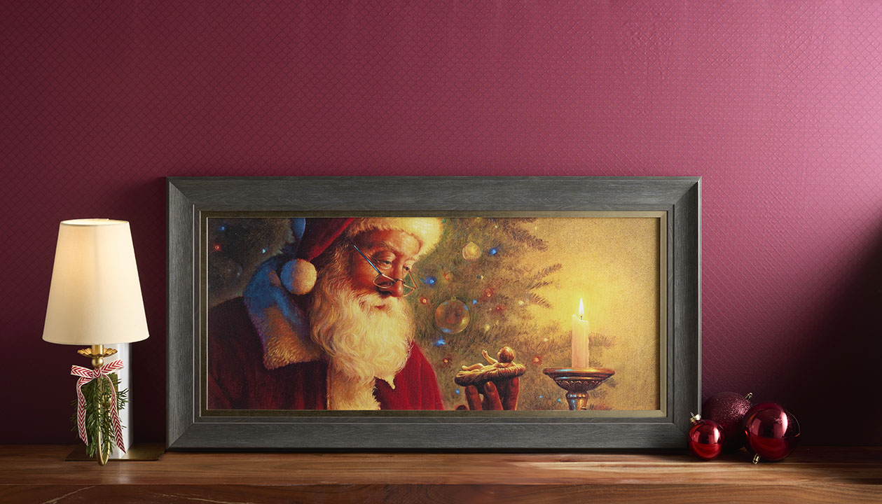 Celebrate the sacred beauty of the season with Greg’s beloved painting, The Spirit of Christmas. This intimate portrait captures Santa in a quiet, reverent gaze toward the Christ child—a moment that has moved countless viewers to lean in and reflect. Soft candlelight and gentle focus draw the eye to the heart of the scene, inviting a sense of wonder and devotion. Housed in a double moulding frame with a dark grey outer edge and muted gold inner trim, the piece radiates warmth and elegance. Measuring 18×35 overall, this framed canvas print is a timeless addition to your holiday décor—perfect for inspiring reflection and honoring the true meaning of Christmas.